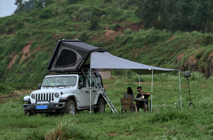Sur le terrain, l’auvent Wild Land se révèle pratique et rapide à mettre en place. Le montage peut être réalisé seul en respectant la méthode suivante : déployer la toile, positionner les poteaux télescopiques, fixer temporairement chaque coin, tendre progressivement pour équilibrer la tension, puis ancrer solidement avec les sardines et cordes. En condition normale, l’aire couverte (environ L295 × W528 cm) est suffisante pour installer une table de pique‑nique et trois à quatre chaises, ce qui en fait un choix pertinent pour une pause déjeuner, un camp de base temporaire ou un point d’ombre près du véhicule.
