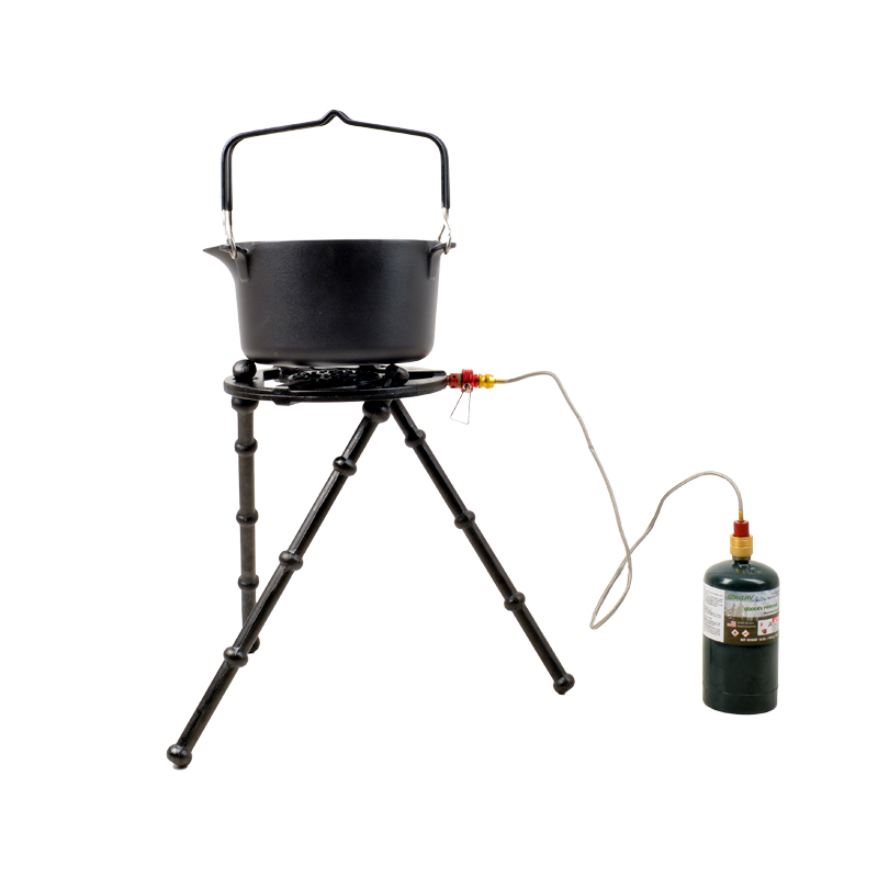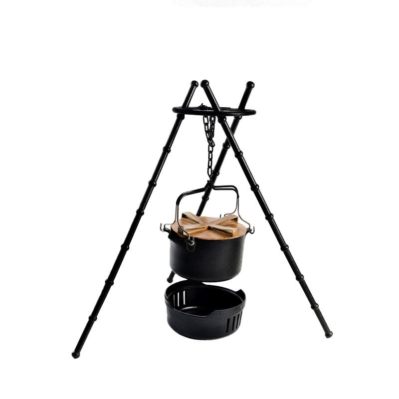 La marmite en fonte est le cœur du système. La fonte est reconnue pour sa capacité à emmagasiner la chaleur et à la restituer de façon régulière, ce qui est idéal pour les plats mijotés, les soupes et les cuissons à basse température. Sur un plan pratique, la fonte tolère bien les températures élevées au‑dessus d’un feu de bois ou d’un foyer au charbon, mais elle nécessite une attention particulière quant à l’entretien pour éviter la corrosion (oxydation) : séchage complet après nettoyage, huilage léger pour protéger la surface, et stockage au sec. Utilisée correctement, une marmite en fonte peut durer de nombreuses années et s’améliorer dans sa performance de cuisson à mesure qu’elle développe une couche d’assaisonnement naturelle.