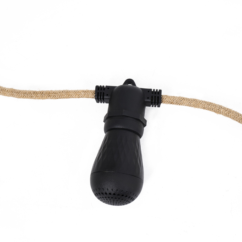La guirlande associe des composants en ABS, PVC, cuivre et silicone, complétés par une gaine en corde de chanvre autour du câble principal. L’ABS assure une structure légère et résistante pour les douilles et boîtiers des ampoules, tandis que le PVC et le silicone contribuent à l’isolation et à la protection des parties conductrices. Le choix de la corde de chanvre vise autant l’esthétique que la tenue mécanique : elle offre un look naturel, protège le câble et facilite la fixation ponctuelle. L’ensemble des matériaux est conçu pour une utilisation extérieure modérée avec une classification IPX4 : protection contre les projections d’eau de toutes directions mais pas une étanchéité complète en immersion.