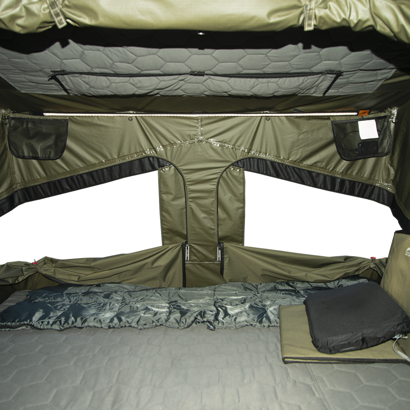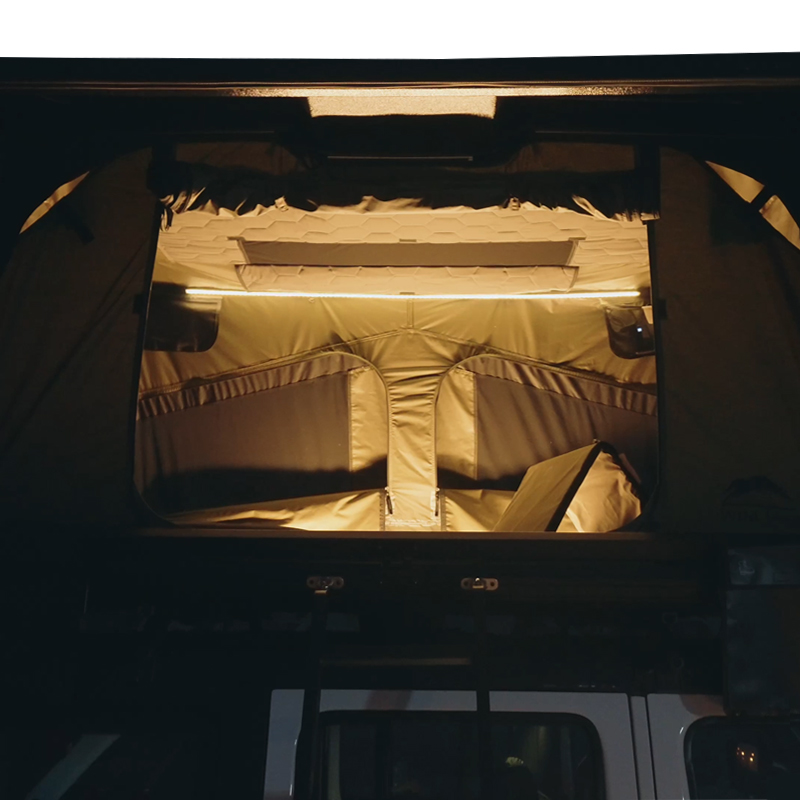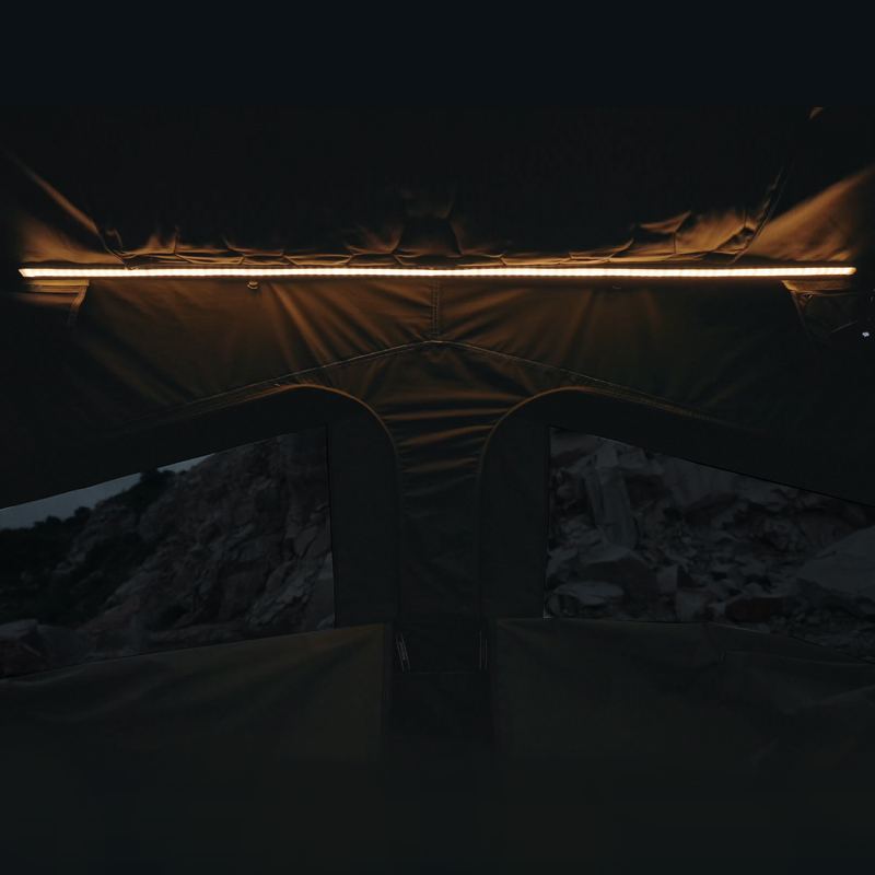 Le principal atout de la Rough Country Adventure Cruiser est la rapidité de mise en place conjuguée à un confort digne d’un couchage « semi-stationnaire ». Le mécanisme hydraulique permet d’ouvrir la tente en quelques secondes sans effort excessif : une fois la tente déroulée et verrouillée sur les barres, il suffit d’actionner le système pour déployer l’ensemble. Le matelas en mousse épaisse intégré offre un confort immédiat et évite l’empilement d’équipements supplémentaires quand on souhaite voyager léger.