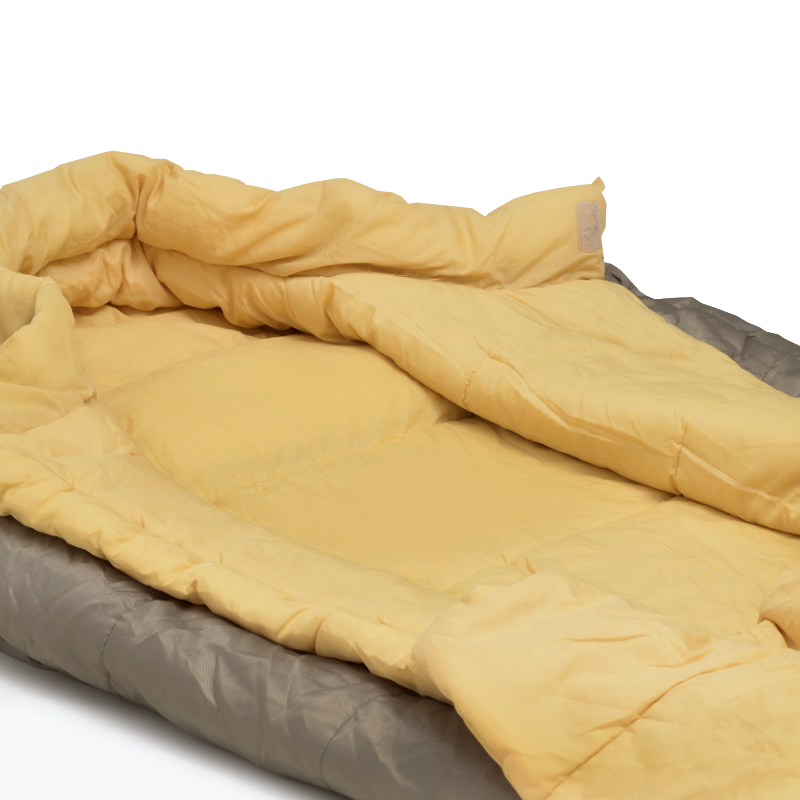 La coque externe en polyester a pour rôle principal de protéger le garnissage et la doublure contre l’usure et les projections légères d’humidité. Le polyester est un choix courant pour les sacs de couchage car il offre un bon compromis entre résistance mécanique, faible absorption d’eau et facilité de nettoyage. Combiné à une doublure coton, il limite le contact direct du corps avec des fibres synthétiques, ce qui peut réduire l’inconfort pour les personnes ayant la peau sensible. L’assemblage des couches (coque, garnissage, doublure) est réalisé pour assurer un maintien du garnissage 3D afin d’éviter le tassement localisé et garantir une isolation régulière sur l’ensemble de la surface du sac.