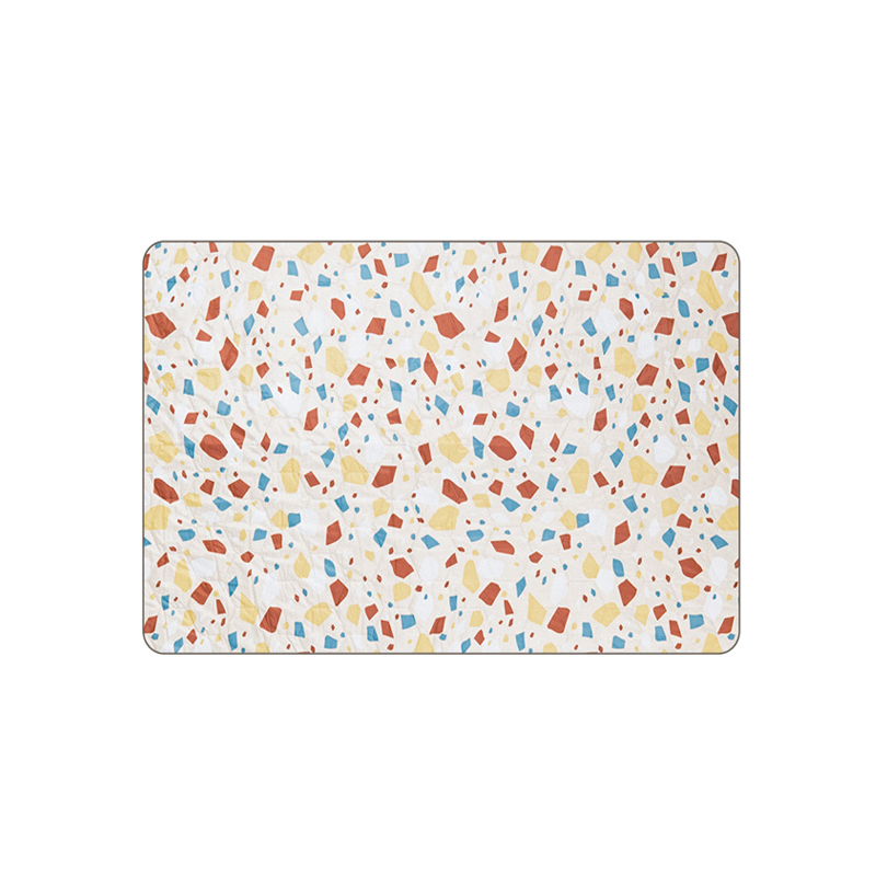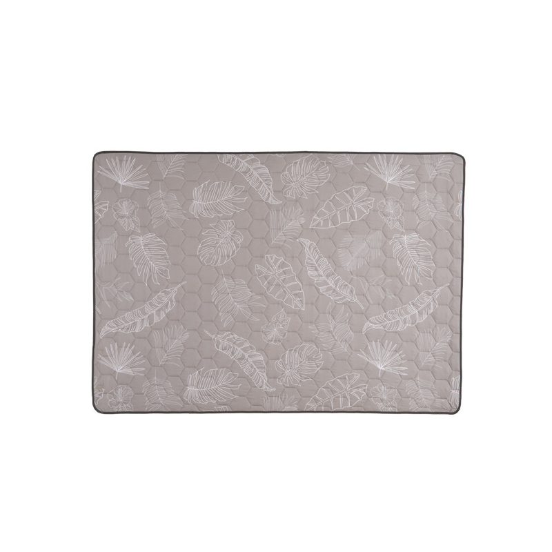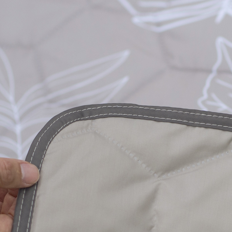 La couche supérieure « peach skin » est choisie pour son toucher et sa tenue. Ce type de finition présente généralement une faible rugosité, une bonne densité de fibres et une sensation chaude au contact, ce qui augmente la perception de confort sans ajouter de poids significatif. Dans le contexte de ce tapis, le peach skin contribue aussi à rendre la surface agréable après des heures d’utilisation, et facilite la pose d’objets tels que couverts, paniers et serviettes sans risque excessif de glissement. En outre, la fiche du produit indique que le tissu a passé la norme OEKO‑TEX Standard 100, gage qu’il est contrôlé pour l’absence de substances nocives pour la santé humaine — une information pertinente pour un usage direct sur la peau, en particulier pour les familles avec enfants.