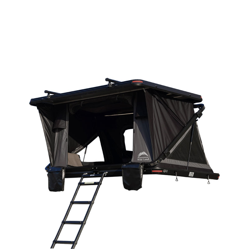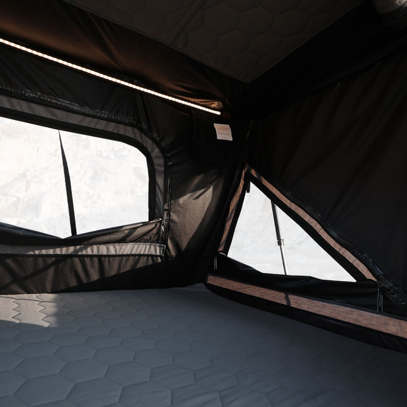 La coque supérieure est en Aluminum Honeycomb Plate, matériau connu pour sa rigidité élevée et son excellent rapport résistance/poids. Ce choix améliore la protection de la tente lors de conditions difficiles, limite les déformations et contribue à une meilleure isolation mécanique contre les chocs et les vibrations. Le châssis et le mécanisme d’ouverture reposent sur le système breveté Wild Land (vérin hydraulique/gaz), réalisé en aluminium. Ce mécanisme assure un déploiement contrôlé et sécurisé tout en réduisant le bruit et l’effort requis. Les deux barres aluminium intégrées supportent jusqu’à 100 kg de charge additionnelle pour fixer des panneaux solaires ou d’autres équipements, solution pratique pour les utilisateurs souhaitant étendre l’autonomie énergétique et l’espace fonctionnel du camp.