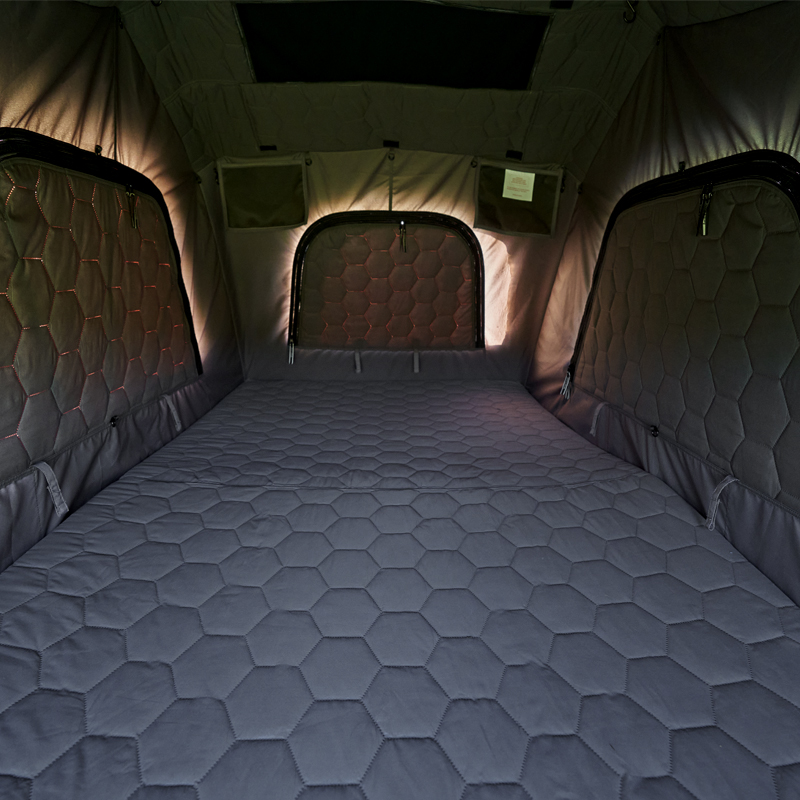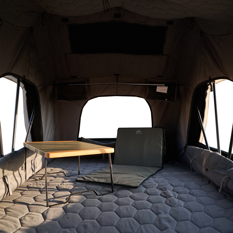 Les matériaux utilisés sont détaillés : le revêtement extérieur est la toile brevetée WL‑Tech, traitée PU pour assurer une résistance statique à l’eau élevée (PU5000–9000 mm selon la fiche). L’intérieur est en 300D poly oxford PU coated, la couche intérieure du toit (fenêtres et portes) est en tissu thermique spécialement conçu (200 g/m²). Le plancher s’appuie sur un 210D polyoxford PU coated avec 3000 mm d’étanchéité. La base combine des plaques nid d’abeille en fibre de verre et en aluminium pour concilier légèreté et rigidité. Le châssis intègre une échelle télescopique en aluminium et des vérins pour ouvrir/fermer la coque.