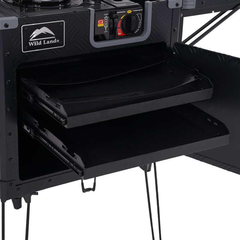 Sur le terrain, la Wild Land Integrated Kitchen Box vise à rendre la cuisine en extérieur plus fluide. Le passage du coffret fermé au poste de travail se fait en quelques gestes : déploiement des pieds, coulissement des tiroirs et positionnement du réchaud détachable. Cette séquence réduit le temps nécessaire à l’installation comparé à l’assemblage de modules séparés. Le plan de travail et la stabilité fournie par les pieds repliables offrent une surface assez solide pour des préparations courantes et l’utilisation de petites casseroles et poêles.